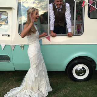 Rose petal confetti led the delighted couple to their amazing reception held at South Hill Farm's Wedding Venue. Wedding guests followed on a trailer built specially by the groom and pulled by his trusty tractor. Mimi fitted in so well and was set amongst the hay bail seats, beautifully decorated marquee, festival style band stage and wood topped hay bail tables with Chess, Jenga and Bunting dressing. The guests danced, played family golf, posed at the rose photo frame, enjoyed the speeches and the amazing food then indulged in the handmade brownies and of course our ice creams (prosecco sorbet a firm favourite!).